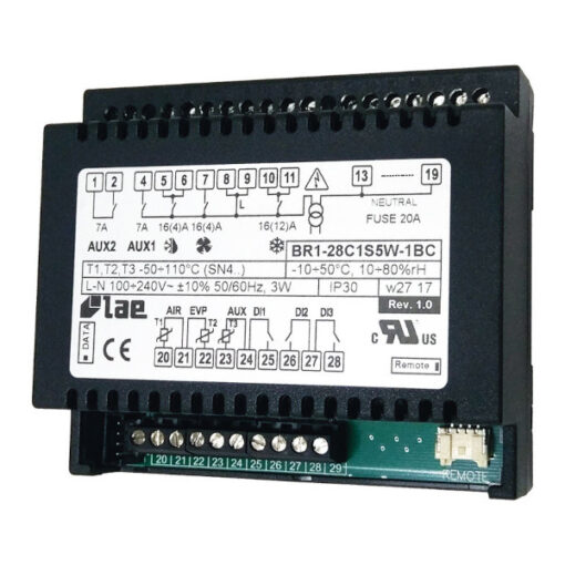 Lae BR1-28C1S5W-2B Intelligentes Split- Kühlstellenleistungsmodul mit Echtzeit- abtauung zur DIN Schienen Montage / Anschluss für DU5-S oder Touchdisplay inkl. 3x Fühler. Die BR1 Module finden durch ihre hohe Leistungsfähigkeit den Einsatz in der Vor-Ort-Steuerung von Kühlhäusern. Ebenso sind sie bei vielen OEM´s im Einsatz und werden daher oftmals als Ersatztype im Serviceeinsatz benötigt.