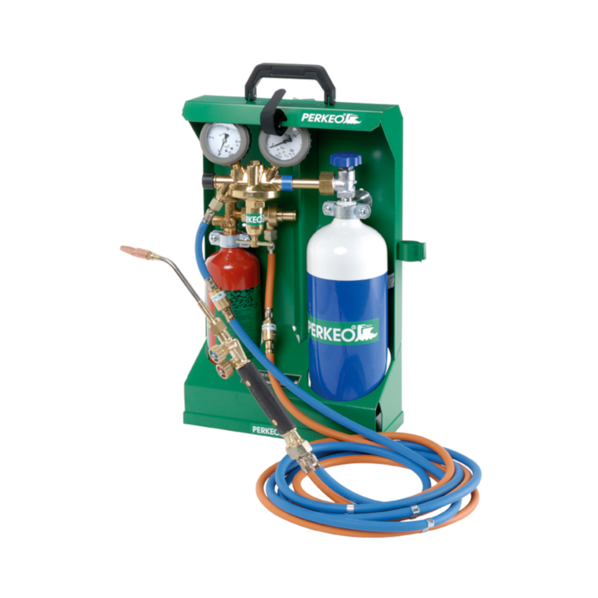 Tragbares Montagegerät ECONOMY Hartlötgerät Propan Sauerstoff mit 0,425kg Propan und 2l O2 Flaschen gefüllt | Propan-Sauerstoff Montagegerät ECONOMY zum Hartlöten mit gefüllten Flaschen. Transportsicher nach DIN EN ISO 11117, UVV VGB 21 und TRG 280 – TÜV-geprüft.